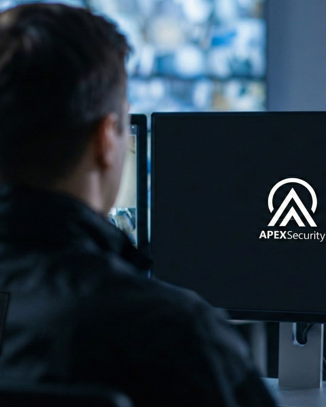 Apex Security Mitarbeiter überwacht mehrere Überwachungsmonitore in der Leitstelle, zentral auf dem Bildschirm ist das Apex Security Logo zu sehen.